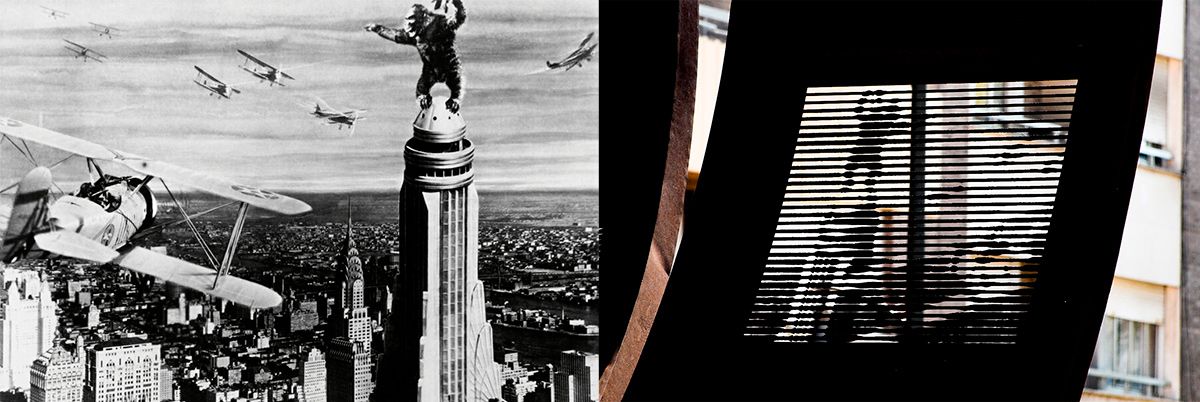 Otra escena mítica parodiada hasta la saciedad. Cualquiera sabe que el gigantesco gorila sube a lo alto del edificio más elevado de la ciudad mientras es atacado por aviones de combate, a la vez que lleva a su amada en la mano... lo que también sabemos todos es que esta historia de amor no acaba bien...
