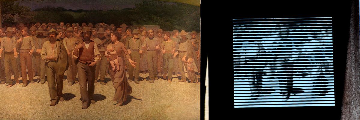 La escena que podemos apreciar en la rotonda es el inicio de la película, lo que vemos es la escena inicial donde nos muestran el cuadro "El Cuarto Estado" una representación que refleja a un grupo de proletarios en huelga, es una obra realizada en el año 1901. Tanto la temática como el año de dicho cuadro son representativas de la película, un inicio perfecto para una de las mejores películas del cine italiano.
