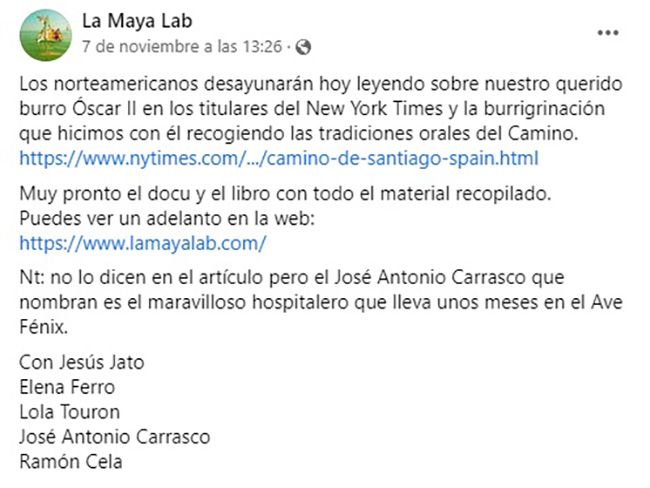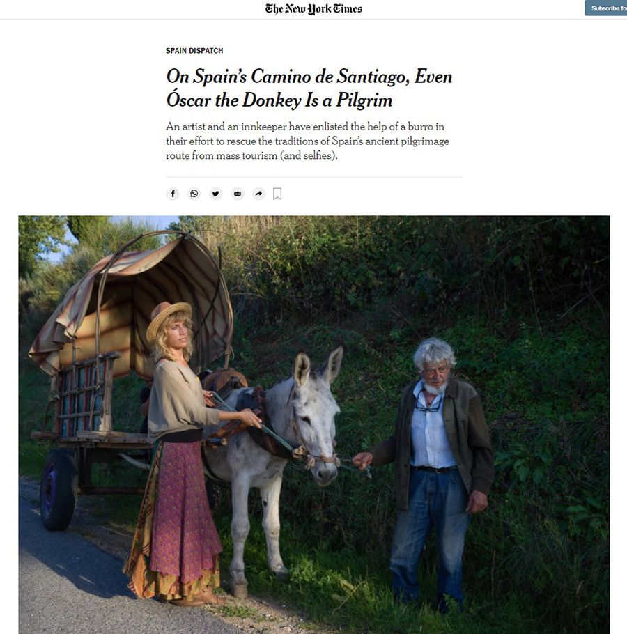 El periódico norteamericano se ha hecho eco de la hazaña que llevaron a cabo hace un año la escultora Irene García y Jesús Jato, el hospitalero de Villafranca del Bierzo que regenta el albergue Ave Vénix. Ambos recorrieron el Camino de Santiago acompañados de un peregrino un tanto peculiar: Óscar, un compañero de cuatro patas que no dejaba a nadie indiferente. La intención de este viaje era recoger las últimas tradiciones orales jacobeas.