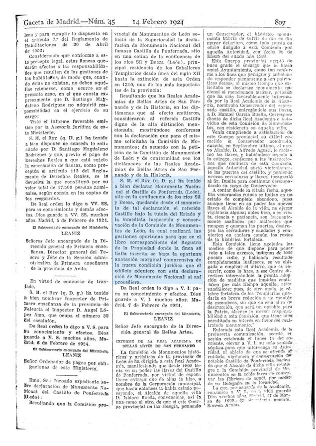 "S.M. el Rey (q. D. g.) ha tenido a bien declarar Monumento Nacional al Castillo de Ponferrada (León), sito e la confluencia de los ríos Sil y Boeza, quedando desde el momento de tal declaración el referido Castillo bajo la tutela del Estado y la inmediata inspección y conservación de la Comisión de Monumentos de León", publicaba la Gaceta de Madrid el 14 de febrero de 1924. Con esta declaración, la fortaleza pasaba a estar bajo la tutela del Estado y se ponía freno a los "desaguisados" que había sufrido en las primeras décadas del siglo XX, aunque no evitó su deterioro, teniendo que esperar otras dos décadas para recibir las primeras 10.000 pesetas para obras urgentes.