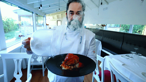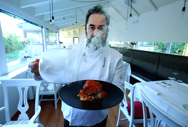 Además, antes de servirse, el plato recibe una bocanada de humo que le aporta un sabor casero y que proporciona un bonito espectáculo visual cuando se lleva a sala presentado en una cúpula de vidrio que retiene el humo y que se descubre ante la atónita mirada del comensal. “Al que conoce el plato, ese sabor a humo le recuerda a la matanza en casa de los abuelos, cuando los botillos se ahúman y se dejan secando”, subraya el cocinero.