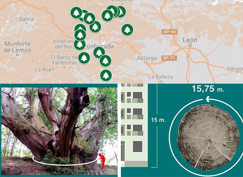 Es el caso del Tejo de San Cristóbal de Valdueza (Ponferrada), un ejemplar con más de 1.200 años, o 'El Campano' de Villar de Acero (Villafranca del Bierzo), considerado el castaño más grande de España. Estos son solo dos ejemplos, pero en InfoBierzo hemos recopilado 16 ejemplares dignos de visitar para motivar -tanto a bercianos como a turistas- a realizar una excursión y disfrutar de sus cualidades especiales e inconfundible belleza.