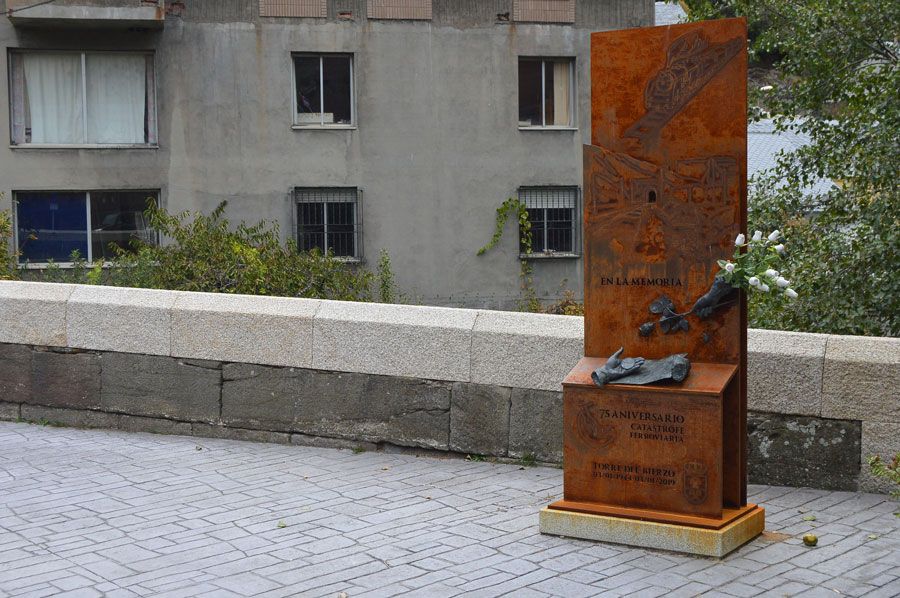 Escultura en recuerdo del accidente ferroviario de 1944, de Tomás Bañuelos, al lado del puente de piedra. Foto: Francisco L. PozoEntre los montes de Santa Cruz y Santa Marina
