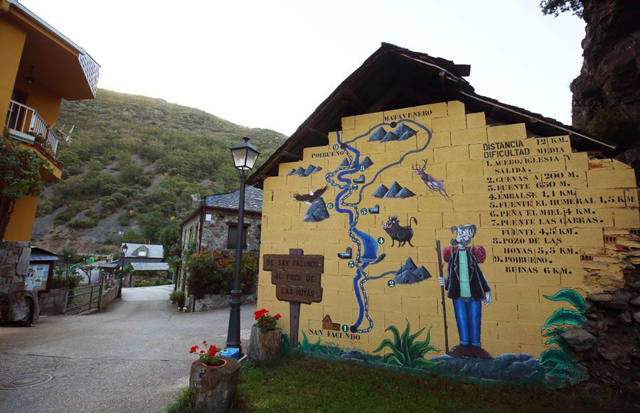 El pueblo de San Facundo, con el mapa de la ruta a Poibueno y Matavenero. Foto: C. Sánchez