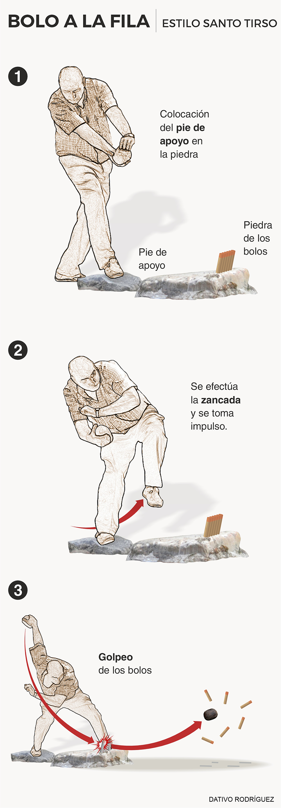 A la hora de tirar, se coloca el pie de apoyo en otra piedra algo alejada de donde se sitúan los bolos, se da una zancada para coger impulso y se golpean