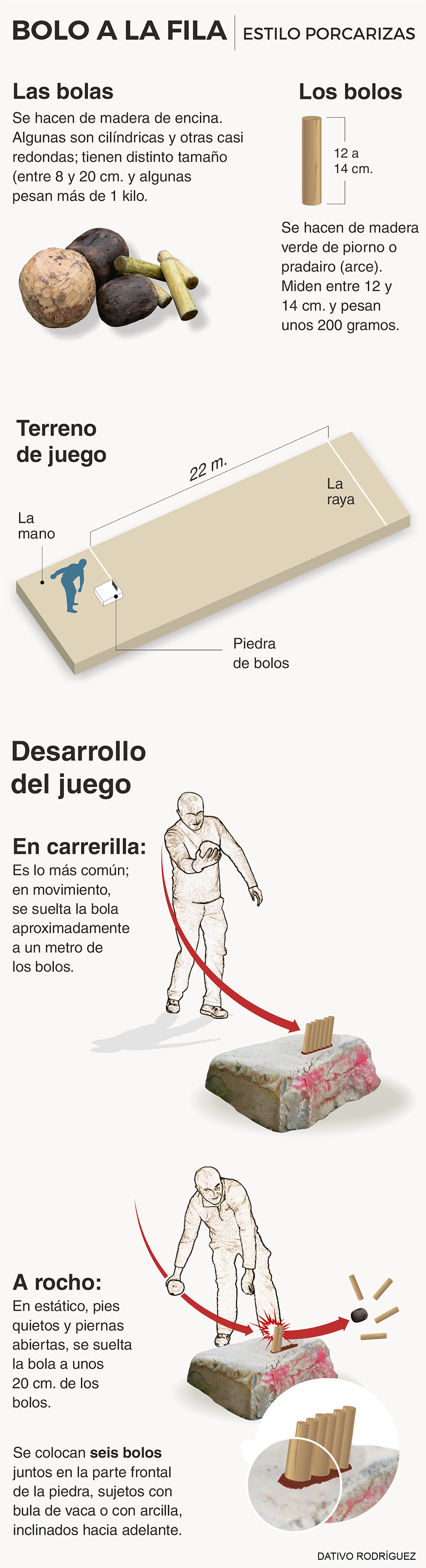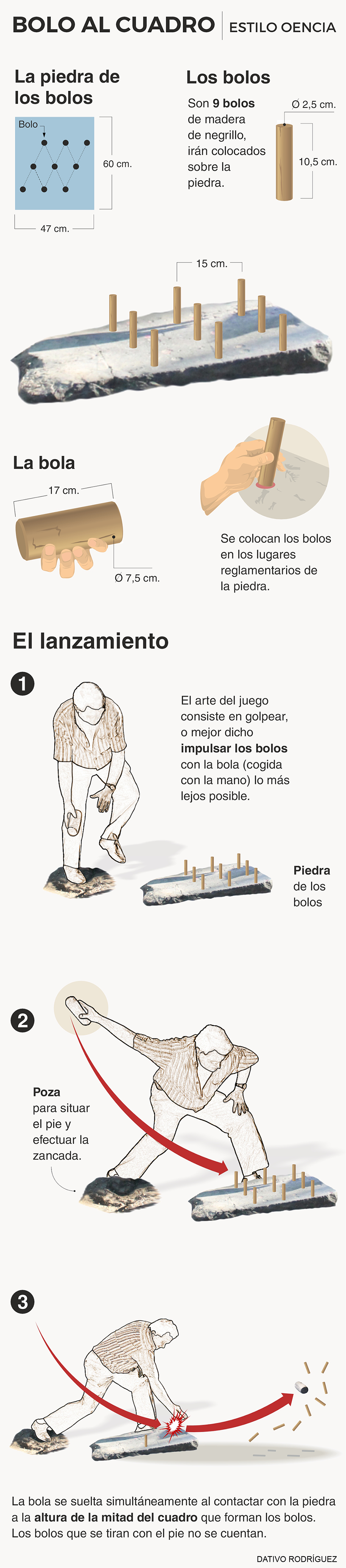 El grafista de InfoBierzo, Dativo Rodríguez, ha elaborado unos gráficos con los que visualizar de manera más fácil cómo se juega a este deporte, los bolos, la distribución de los mismos, la manera de derribarlos, etc. Así, repasamos el estilo usado en Oencia, Porcarizas y Santo Tirso. Nunca es tarde para aprender un nuevo deporte, y con estas instrucciones ya no hay excusa.