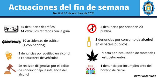 En cuanto a los controles de alcoholemia y drogas al volante, la Policía de la capital berciana realizó 16 controles entre los días 8, 9 y 10 de octubre, de los cuales tres arrojaron resultado positivo. Durante dichos días, los agentes impusieron un total de 55 denuncias de tráfico y fueron necesarios 14 servicios de la grúa.