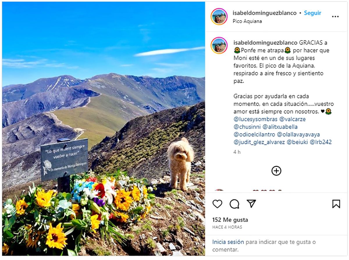 Instagram @isabeldominguezblancoUn emotivo mensaje de su hermana, Isabel Domínguez agradecía el merecido homenaje recibido por la periodista ponferradina: "GRACIAS a ?Ponfe me atrapa? por hacer que Moni esté en uno de sus lugares favoritos, El pico de la Aquiana, respirado a aire fresco y siento paz. Gracias por ayudarla en cada momento, en cada situación…..vuestro amor está siempre con nosotros. ♥️?", señala a través de su Instagram.