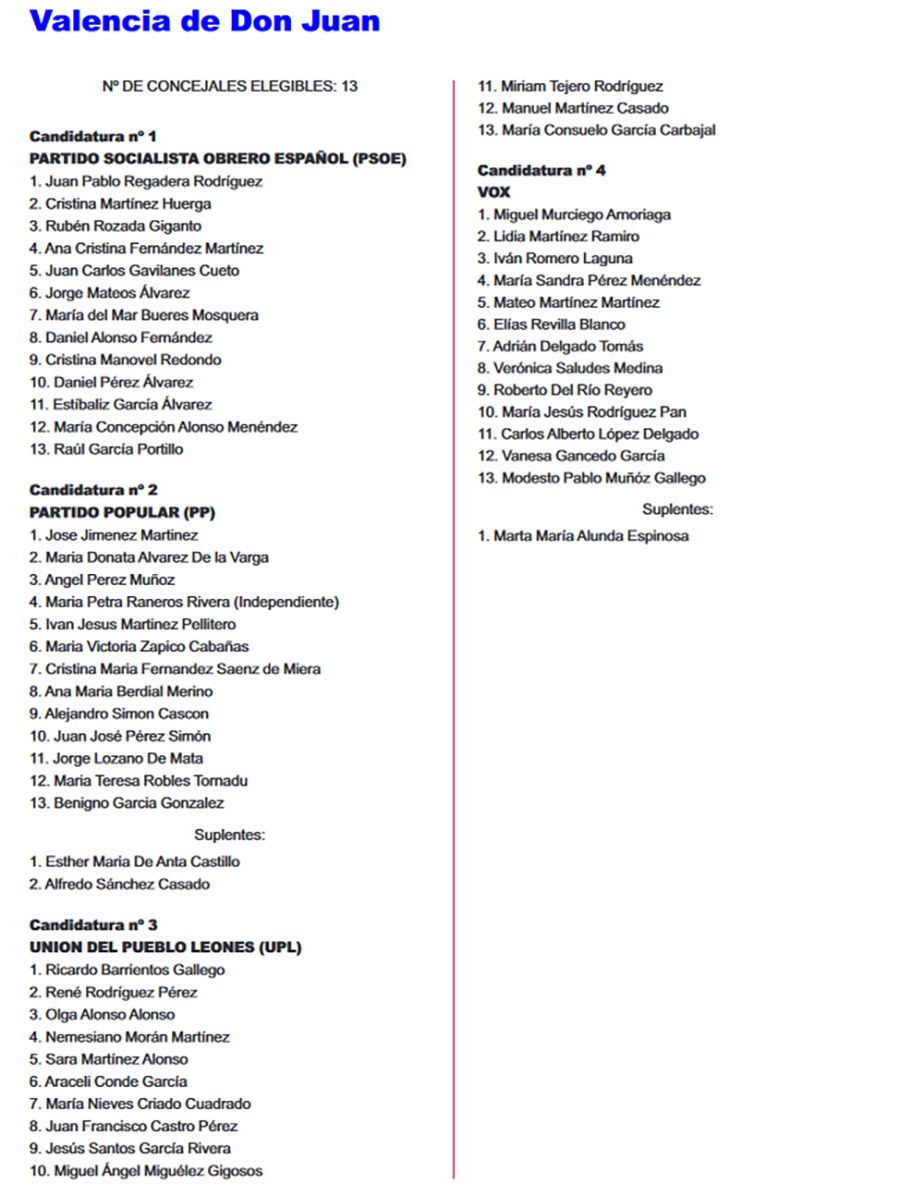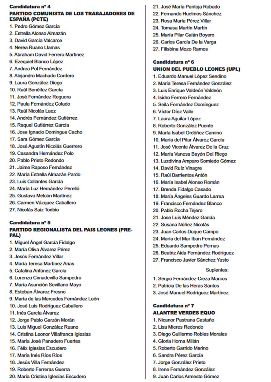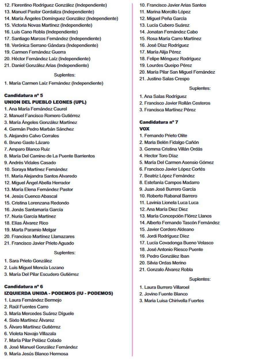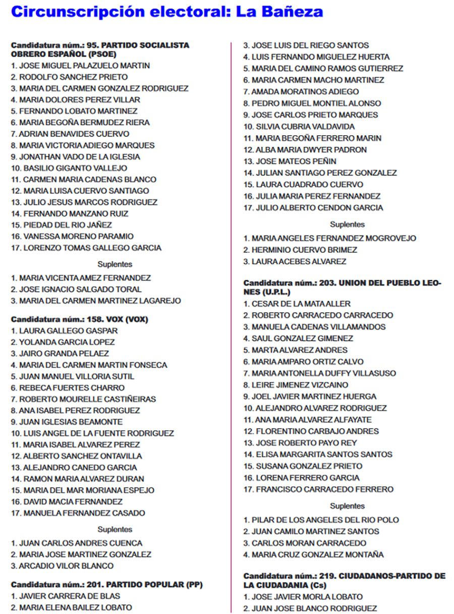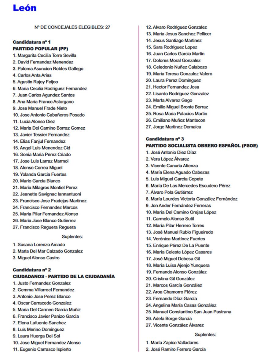 El Boletín Oficial de la Provincia (BOP) ha publicado este miércoles 26 de abril, el listado completo de las candidaturas que concurrirán en todos los municipios de León para las Elecciones Municipales del 28 de mayo. Se trata del listado provisional de las listas completas -candidatos e integrantes- y las definitivas se certificarán el martes de 2 de mayo.