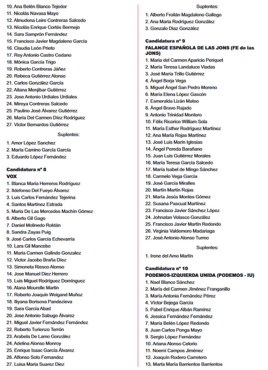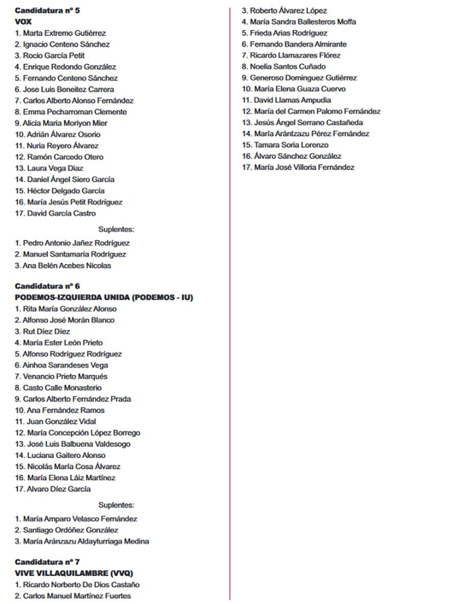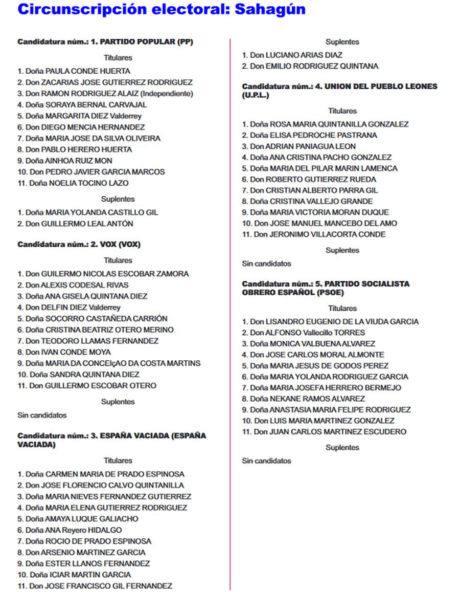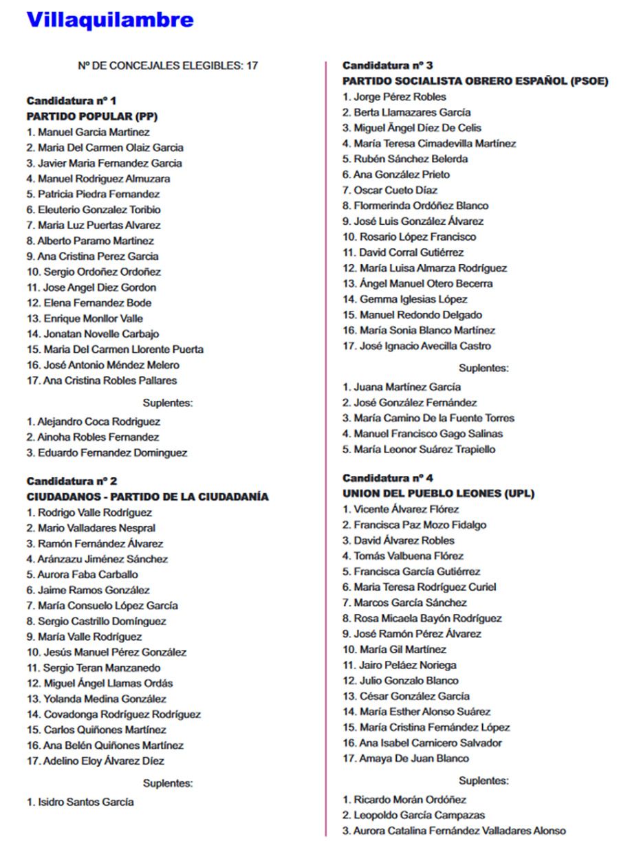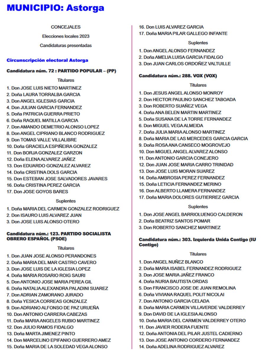 El Boletín Oficial de la Provincia (BOP) ha publicado este miércoles 26 de abril, el listado completo de las candidaturas que concurrirán en todos los municipios de León para las Elecciones Municipales del 28 de mayo. Se trata del listado provisional de las listas completas -candidatos e integrantes- y las definitivas se certificarán el martes de 2 de mayo.