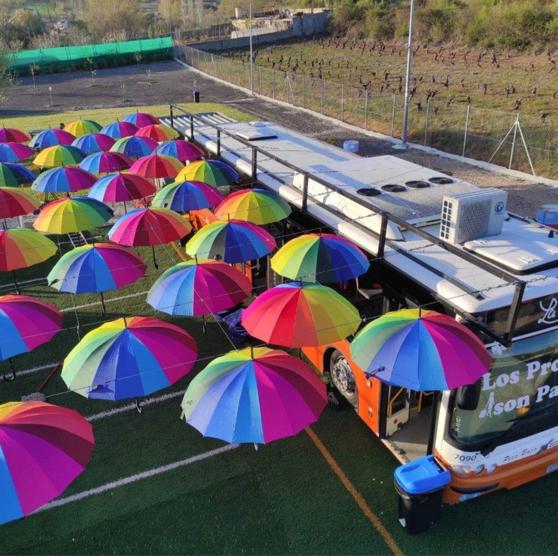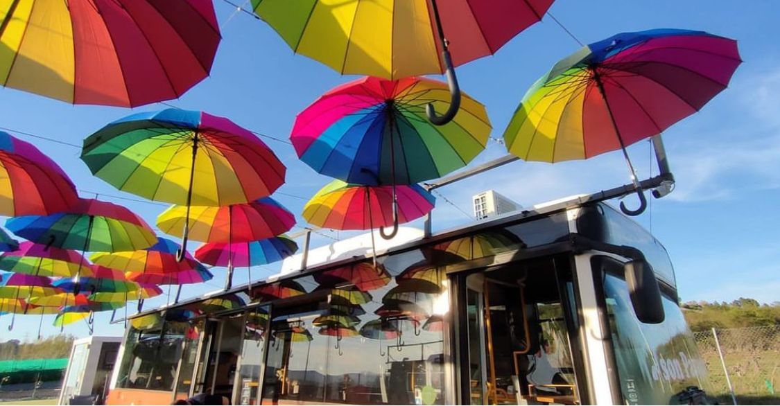 Con el buen tiempo, vuelven las terrazas al aire libre, en este caso, un autobús urbano deja a un lado la función con la que fue diseñado para ser un espacio de comida y disfrute acompañado por una terraza cubierta de paraguas que sirven, además de como sombrillas, como incentivo y atractivo visual.