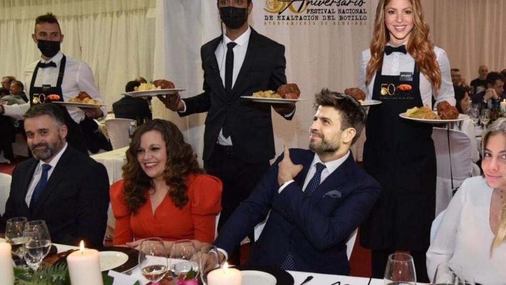 El exjugador del Barça aparece sentado junto a la alcaldesa Silvia Cao, y junto a él, su novia Clara. Detrás, de camarera está la cantante, clara-mente no le hace mucha gracia.