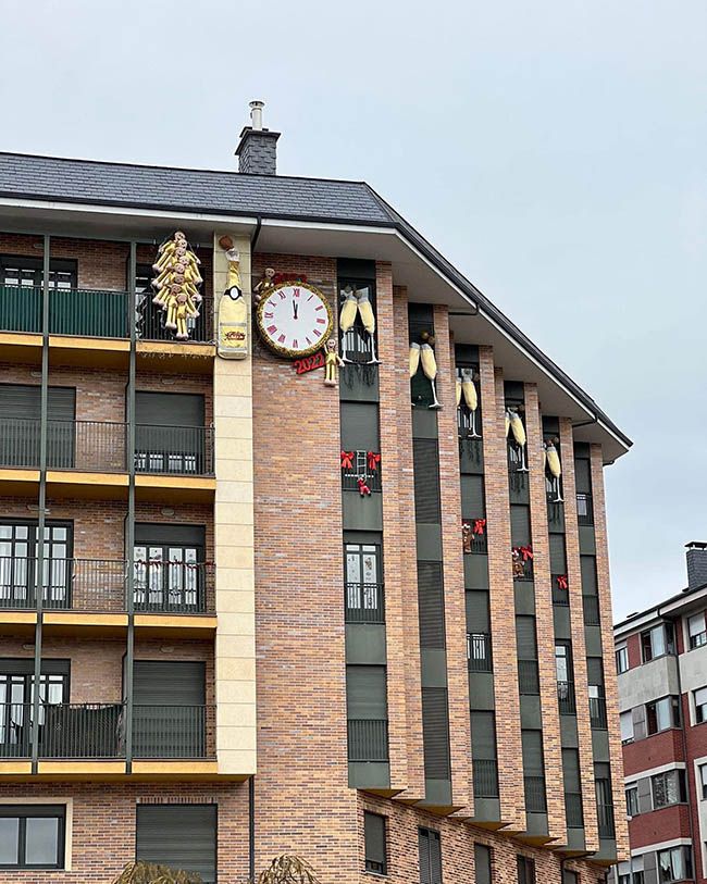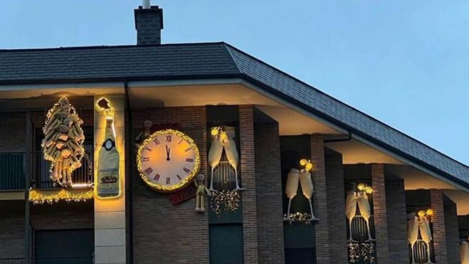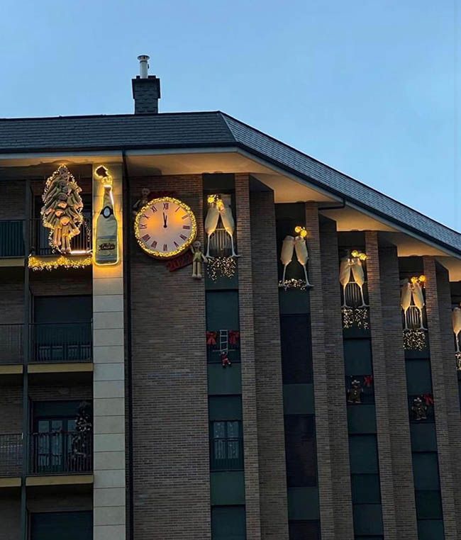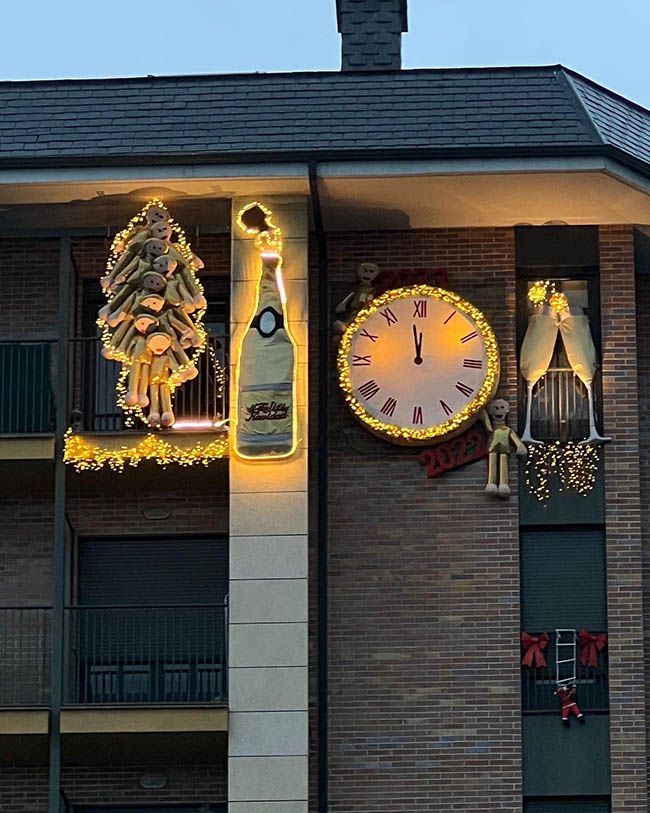 Foto: Conchi Berguño / FacebookConcretamente, este año, las copas de champán, el reloj con las campanadas y las burbujas de Freixenet han sido el hilo inspirador que ha resultado lo que se puede observar a simple vista, y que cada noche por estas fechas navideñas, se puede disfrutar cerca del aparcamiento del Albergue de Peregrinos, San Nicolás de Flue.