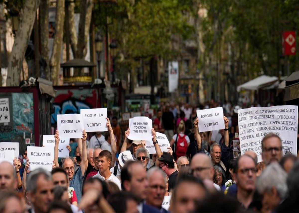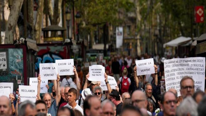 Los asistentes han leído un poema y la lista de fallecidos en los ataques en Barcelona y Cambrils en 2017, con muchos carteles de "exigimos la verdad" o "exigimos responsabilidades", ya que consideran que no se explicó el vínculo entre el CNI y el imán de Ripoll, cerebro yihadista de los atentados, y aluden a unas declaraciones hace ocho meses del ex comisario Villarejo.