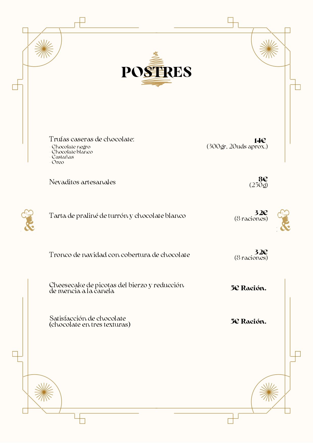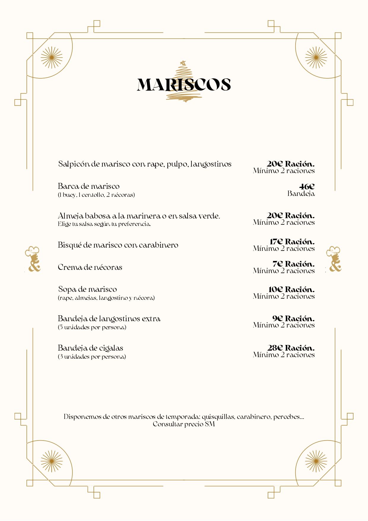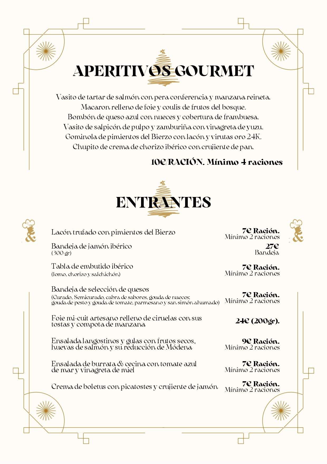 Dentro de las posibilidades de Pedidos Gourmet se puede disfrutar de aperitivos, entrantes, mariscos, pescados, carnes y postres. Aquí os dejamos la carta completa.