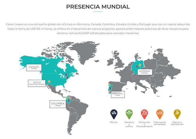 Clever Leaves cuenta con operaciones e inversiones en más de 15 países, como Alemania, Canadá y Portugal, con el objetivo de operar siempre en cumplimiento de las leyes federales y estatales de cada país, haciendo especial hincapié en el cultivo sostenible y a gran escala, de cannabinoides con fines sanitarios.
