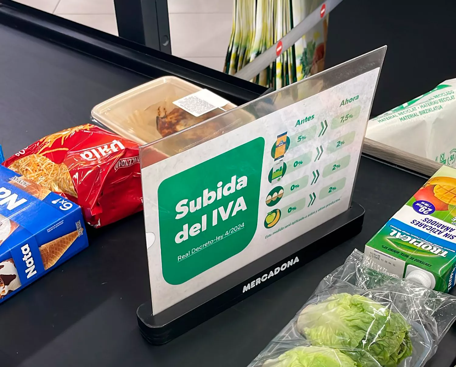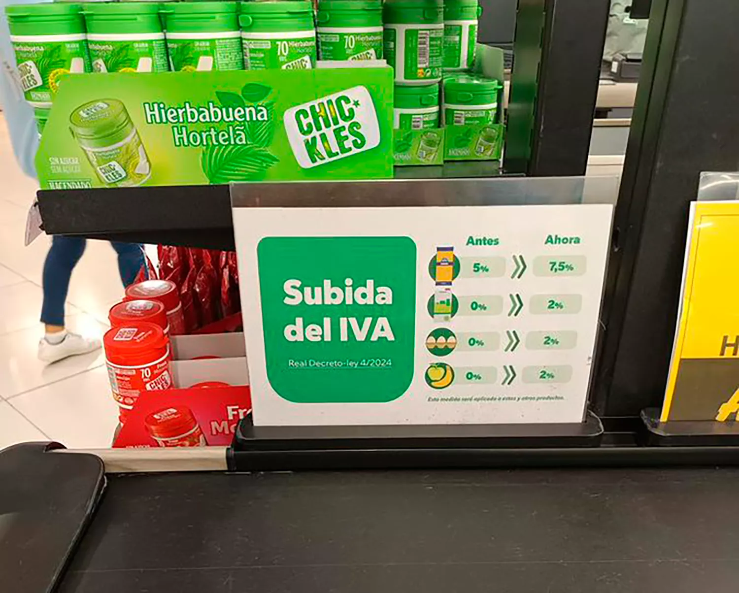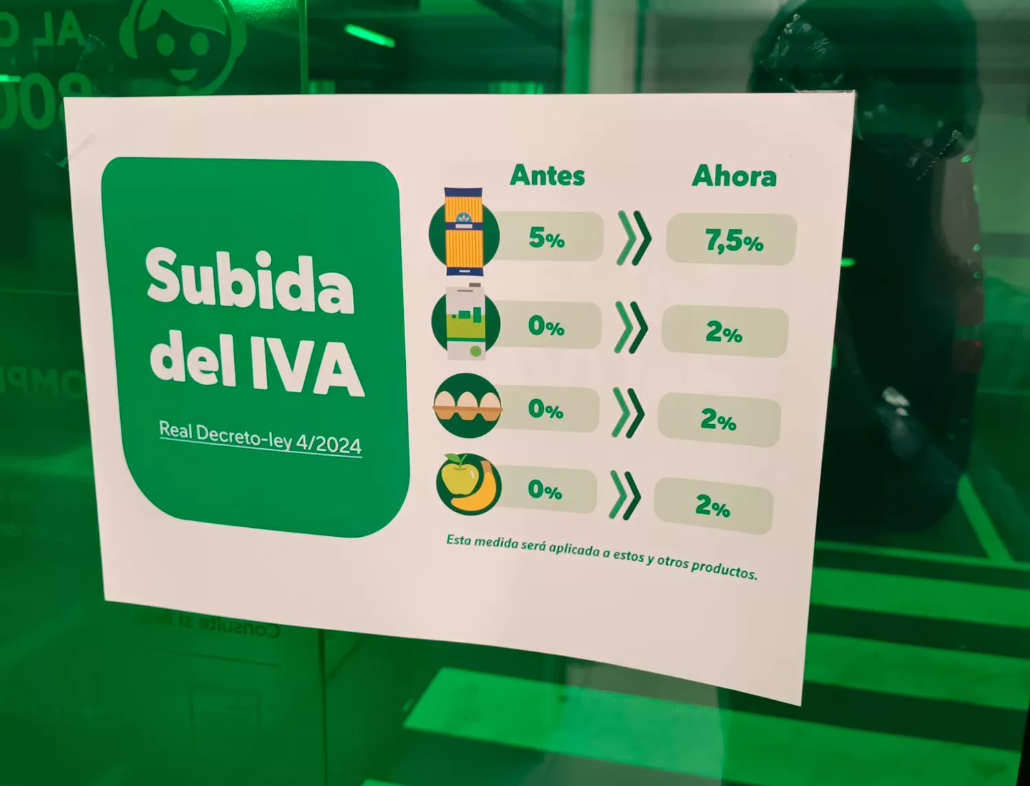 En el cartel se puede leer claramente la frase "subida del IVA", aclarando que esto se debe al Real Decreto-ley 4/2024. Además, aparecen representados los productos que vieron un incremento en sus precios, con su respectivo porcentaje, desde el martes 1 de octubre.
