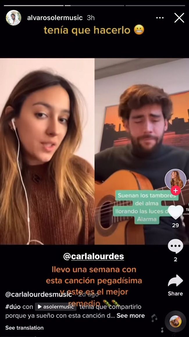 La artista berciana, Carla Lourdes, asentada en la costa gallega, más concretamente en Vigo, ha revolucionado las redes sociales tras el dúo de TikTok hecho con la canción "A Contracorriente" del cantante español, Álvaro Soler. Lo que parecía un vídeo típico de esta red social, ha tomado otro rumbo, cuando Soler encuentra esta publicación de Carla Lourdes y no duda ni un minuto en compartir en sus 'stories' este dúo de TikTok en el que el artista pop español, presume orgulloso de la voz de Carla Lourdes. Por tanto, la Comarca del Bierzo sigue dejando huella en todos los ámbitos, y entre ellos, uno de los más relevantes del momento, la música joven con ADN berciano.