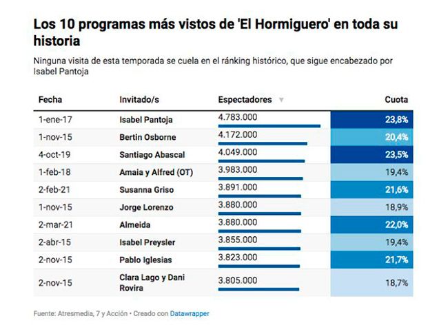 Aun así, la magia del programa que sigue triunfando del mismo modo que cuando empezó en 2006, aunque ninguna de las visitas de esta temporada se ha colado en el ranking de las más vistas de su historia.