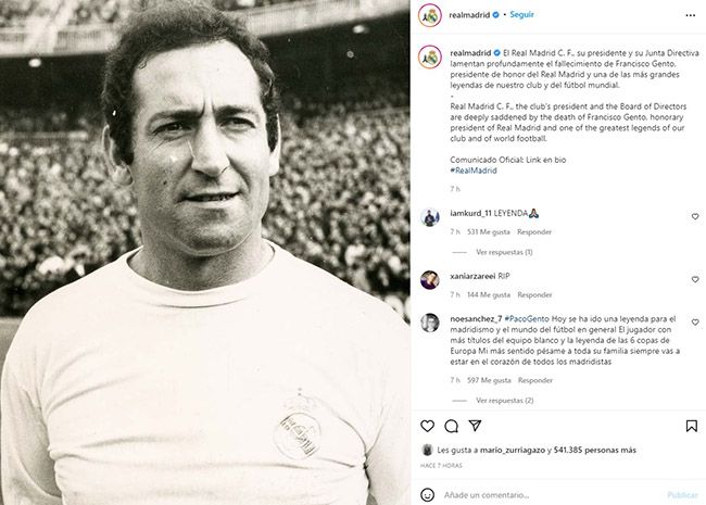 "El Real Madrid quiere expresar sus condolencias y su cariño y afecto a su esposa Mari Luz, a sus hijos Francisco y Julio, a sus nietas Aitana y Candela y a todos sus familiares, compañeros y seres queridos", ha escrito el club en el comunicado difundido.