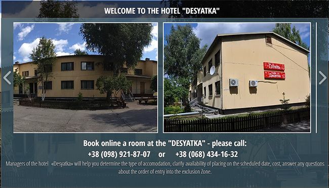 Cualquier persona que quiera visitar esta zona necesita un lugar para dormir, el cual podría ser la capital ucraniana que se encuentra a pocos kilómetros: Kiev. Sin embargo, existen alojamientos en las inmediaciones de Pripyat, dentro de la ZEC y muy cerca de los hechos dramáticos que resultaron en el accidente nuclear más importante de la historia. Uno de ellos, el más conocido, es el hotel Desyatka. Uno peculiar, en tanto que se promociona del siguiente modo: "Recuerda que tu cuerpo está expuesto a una radiación adicional. No toques nada. Todo puede ser una fuente de problemas para ti, tu familia y tus amigos". La paradoja del turismo de catástrofes es que esto es un reclamo, no un desincentivo.