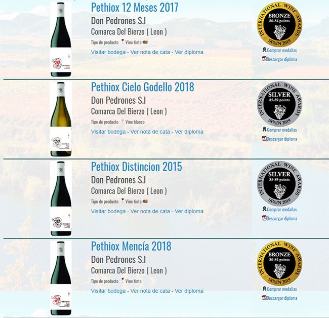 De los 748 premiados (398 españoles), la bodega con sede en Fuentesnuevas ha recibido dos medallas de plata (85-89 puntos) para los caldos Pethiox Cielo Godello 2018 y Pethiox Distincion 2015 y dos de bronce (80-84 puntos) para el Pethiox 12 meses 2017 y el Pethiox Mencía 2018.