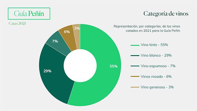 Este es el resultado del conjunto de vinos catados por la Guía Peñín resultando que el 55% de los vinos sometidos a cata eran vino tinto, el 29% vino blanco, un 7% vino espumoso, el 6€ vino rosado y el 3€ vino generoso. Así, la Guía Peñín ha resultado estas cifras después de más de 9.300 vinos de 2.000 bodegas sometidos a cata.