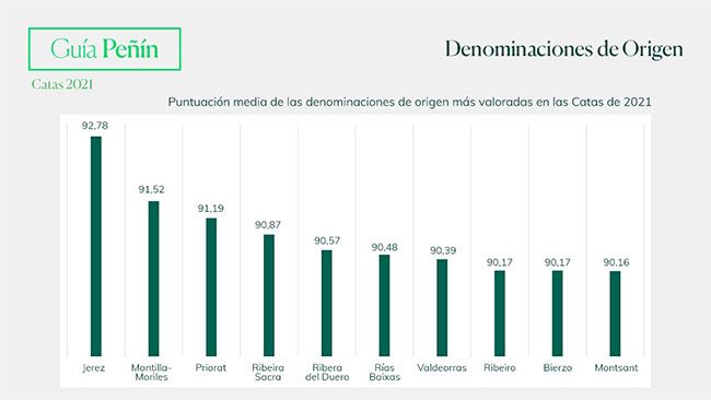 Sin embargo, la mayor puntuación con respecto a denominaciones de origen, la consigue la DO Jerez alcanzando un 92,78% de puntuación media, junto con DO Montilla-Moriles y Priorat que han recibido 91,52% y 90,57% respectivamente.