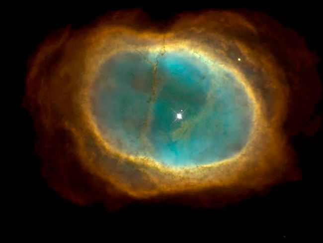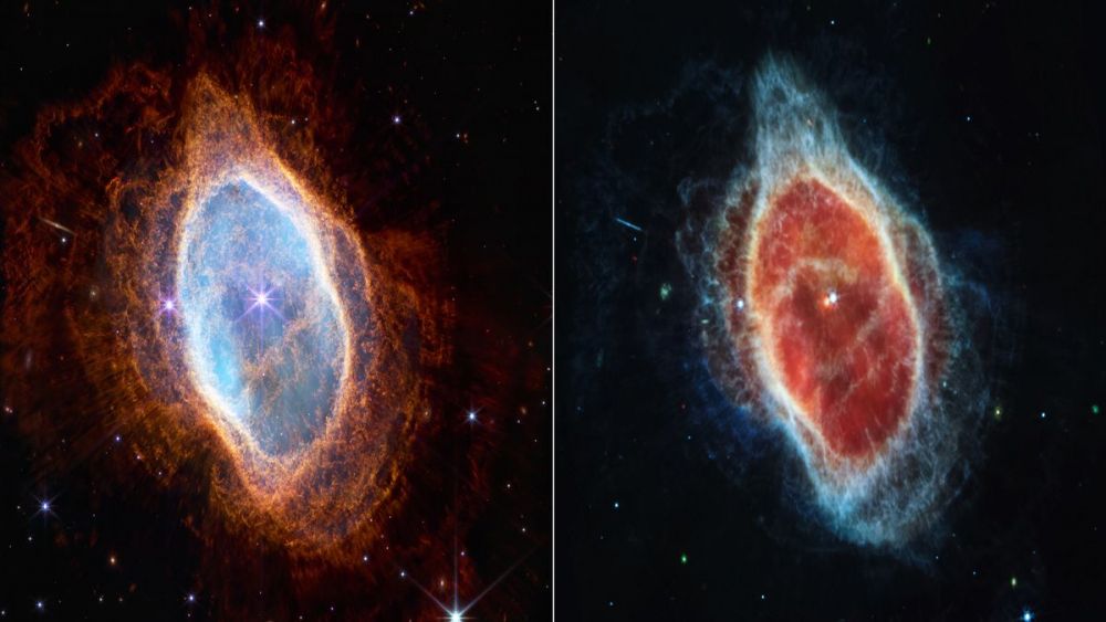 Está a unos 2.000 años luz de nuestro Sistema Solar y su creciente diámetro aproximado es de medio año luz. La nueva imagen muestra dos estrellas distinguibles en el centro de la nebulosa en la imagen de la derecha, tomadas gracias al instrumento de infrarrojos medios (MIRI).