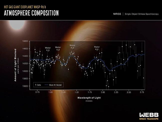El planeta gigante WASP-96b tiene algo menos de la mitad de la masa de Júpiter y se encuentra a unos 1.150 años luz de nosotros, donde orbita a su estrella cada 3,4 días. Esta imagen no es lo que podríamos entender como una fotografía, sino un gráfico del espectro luminoso que la atmósfera del planeta ha dejado a su paso frente a la estrella que orbita.