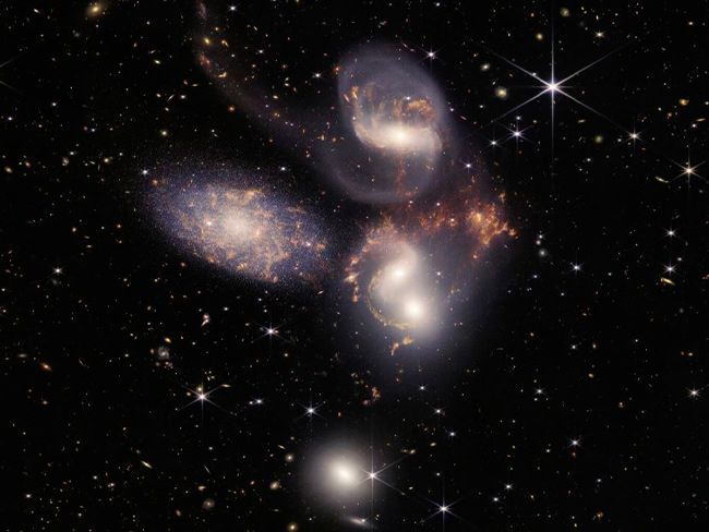 También apreciable en ambas fotos es que aunque el quinteto ocupe un área relativamente pequeña en nuestro cielo, tan solo cuatro de las galaxias son cercanas entre sí. La quinta, la que se muestra más a la izquierda, está notablemente más cerca de nosotros que el resto. En ella pueden apreciarse con mejor detalle sus estrellas.
