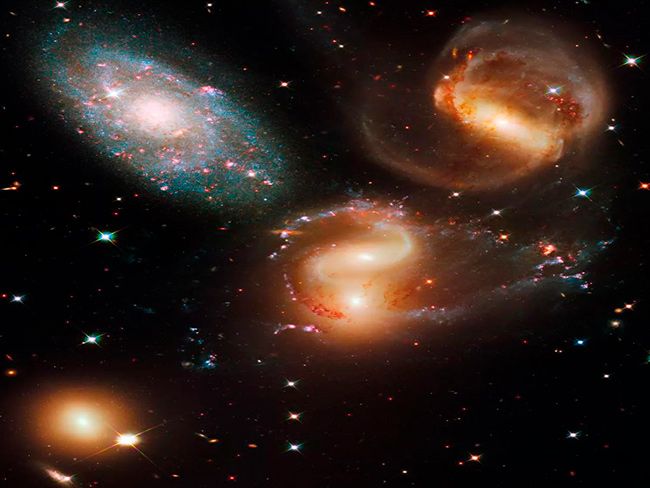 Cuatro de estas galaxias están lo suficientemente cerca como para que las interacciones gravitatorias entre ellas hayan causado un “baile” de estrellas, deformándolas ligeramente. Es precisamente este baile lo que hace estas imágenes de extrema utilidad, enseñándonos cómo interactúan las galaxias cuando se acercan las unas a las otras. Esta interacción es especialmente visible en las dos galaxias centrales, que aparentan ser una sola.