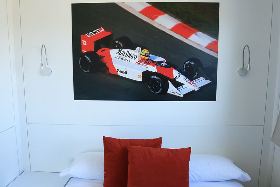 Así, el bungaló blanco rinde homenaje al brasileño Senna, el piloto más rápido de la historia, con fotos de sus carreras, los distintos coches, su tradicional casco y con un toque rojo en 'honor' a su McLaren, con el que compitió en los grandes premios de F1 desde 1988 hasta 1993.