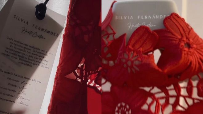 La pieza confeccionada por la marca berciana es un vestido midi con cuello halter y una capa de gasa para la ceremonia. "La espalda es una auténtica obra de arte con botones joya", explicaba en el post compartido y añadía que "cada pieza de ella -Silvia Fernández- es un auténtico tesoro made in Spain". A lo que la diseñadora le contestaba "siempre es un sueño diseñar para ti".