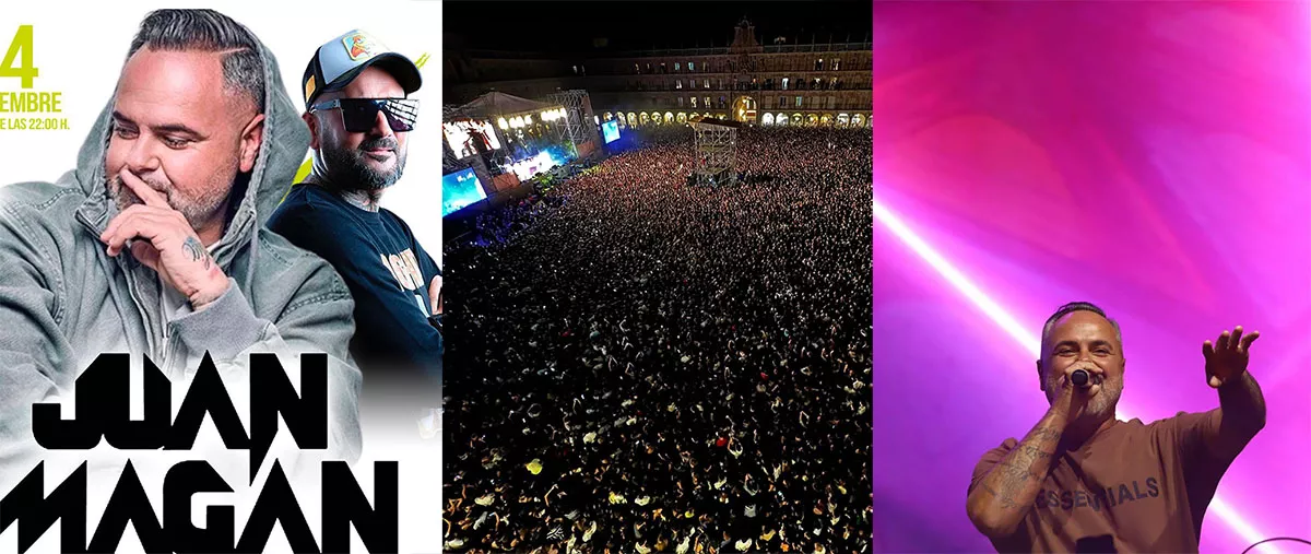 Juan Magán era el protagonista de la programación de fiestas de Salamanca y fue el absoluto 'rey' de la noche charra. El concierto del artista con otros dos 'DJs', Andrew y Albert Novo hizo un 'lleno' en la Plaza Mayor de la ciudad que desde horas antes del concierto, tenía el aforo completo.