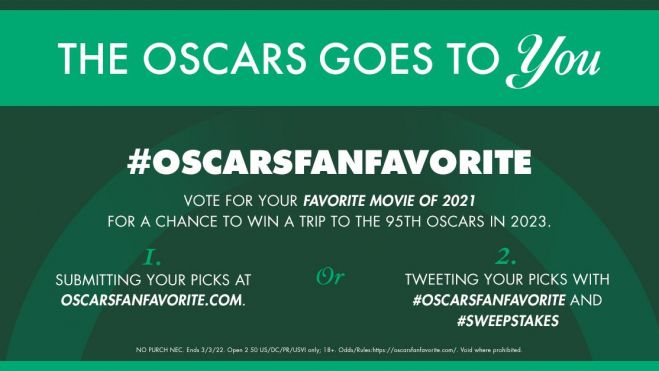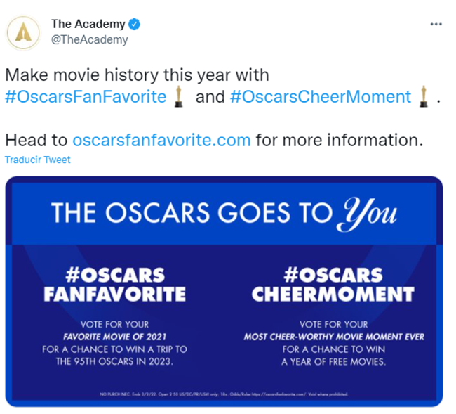 "Vota por tu película favorita de 2021 y tendrás la oportunidad de ganar un viaje a la 95º gala de los #Oscar en 2023. Vota un máximo de 20 veces al día hasta el 3 de marzo tuiteando tu elección junto a #OscarsFanFavorite y #Sweepstakes o visita oscarsfanfavorite.com".