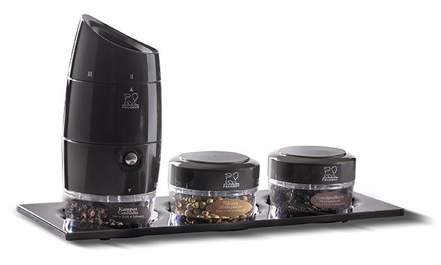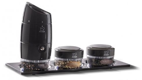 El molinillo se vende acompañado de tres cargas de pimientas distintas: Kampot -pimienta negra con notas frutales-, Voatsiperifery -pimienta negra de sabor único e intenso-, y Sikara -pimienta blanca de aromas naturales-. Además, se complementa con una bandeja para servirlo con estilo y un libro de recetas exquisitas. Por separado también se pueden adquirir otro tipo de pimientas gourmet, como la pimienta negra Ba Ria, con sabores que recuerdan a tomates y frutas, el mix de pimientas especiales para carne y para pescado, y la pimienta de las cimas Vinh Dinh, con notas cítricas y de anís.