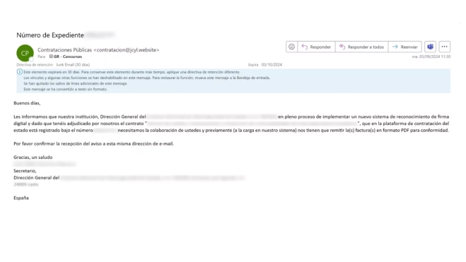 La campaña afecta a cualquier empresario, autónomo o empleado que haga uso del correo electrónico y reciba un mensaje con las características descritas, en especial aquellos que hayan participado en una oferta de contratación pública.