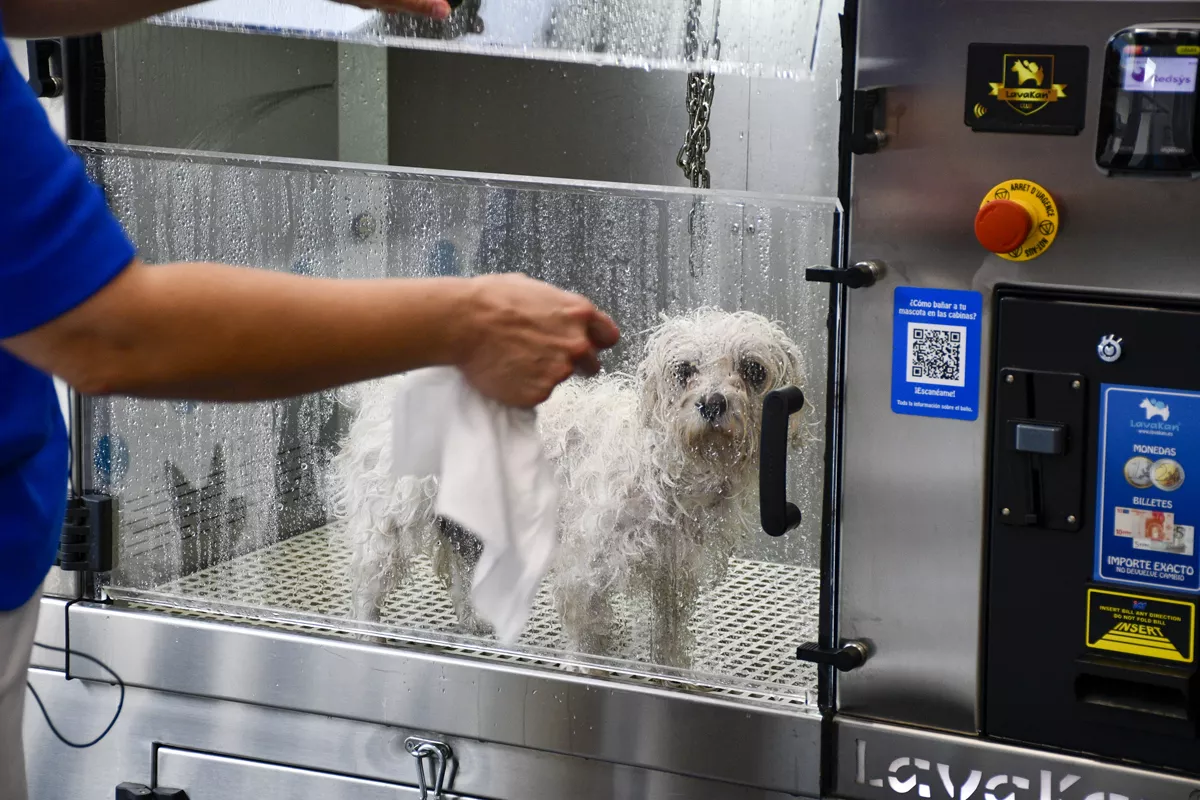 Los pasos a seguir en el baño de nuestras mascotas comienzan por cepillarles bien. A continuación, seleccionaremos qué baño queremos que reciba y, a partir de ahí, tendrá lugar la desinfección de la cámara antes de introducir al animal dentro. Una vez que el perro esté en la cabina, comenzará el baño y, posteriormente, el aclarado. Cuando ya esté complentamente limpio, será el turno del secado y, unos minutos más tarde, ya podremos presumir de 'amiguito'. Lavakan advierte de la importancia del secado de los perros dado que la humedad les puede provocar problemas de piel.