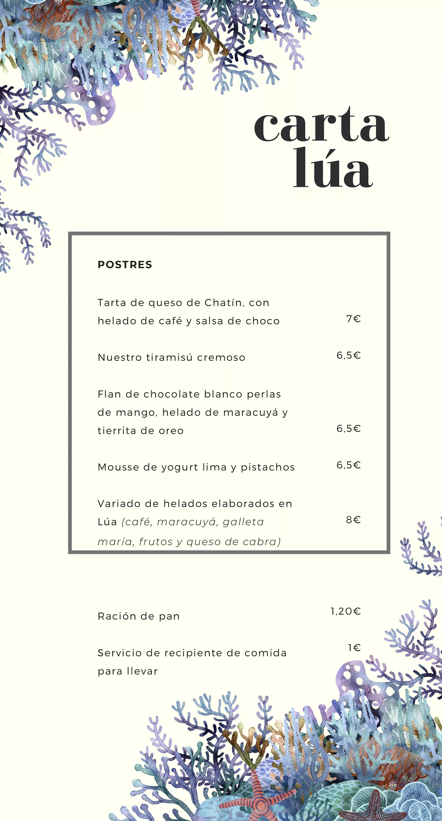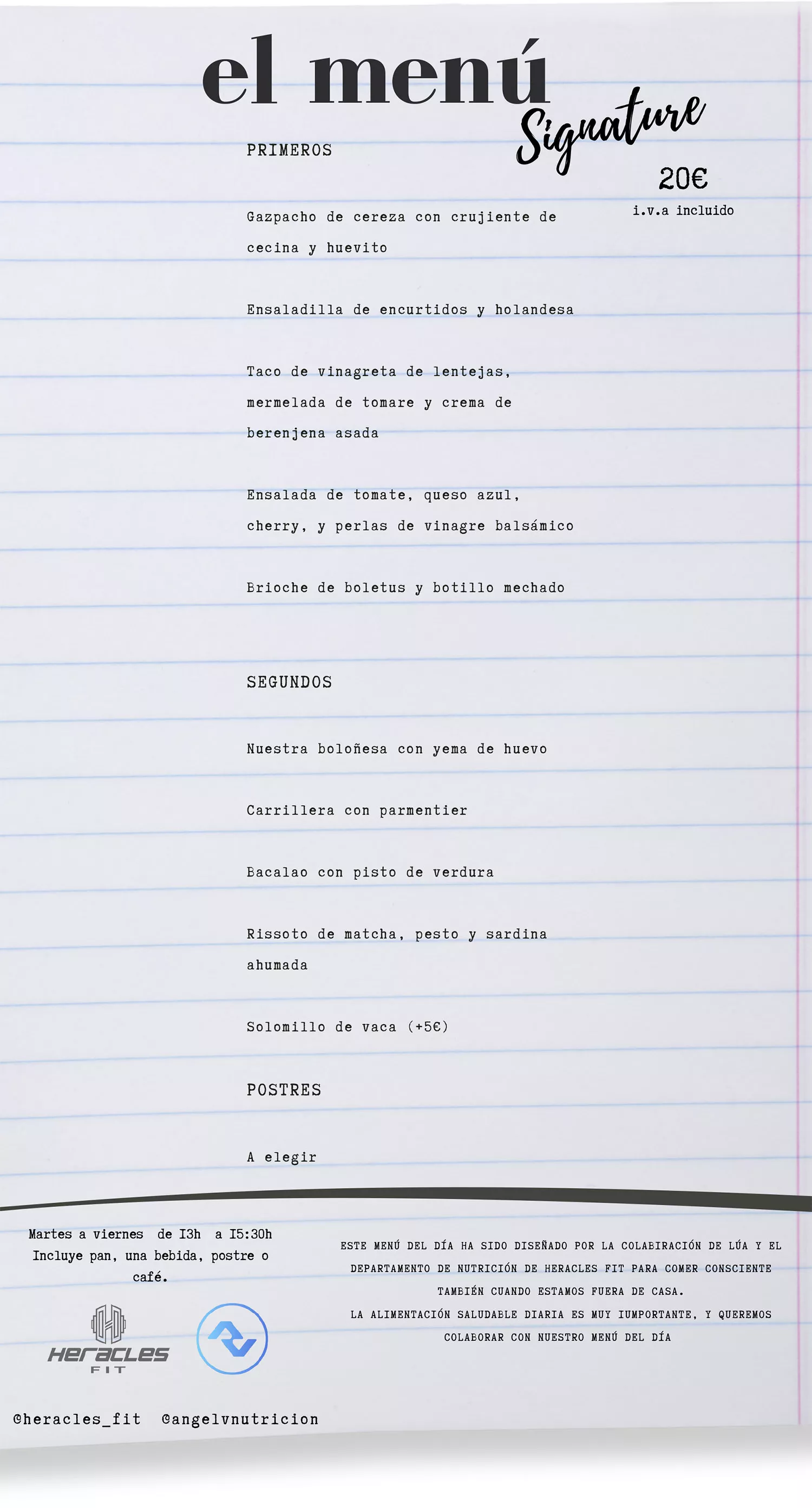 Así, además de la carta con nuevas incorporaciones, también el menú signatura se adapta a la ola de calor. Este menú de 20 euros ha sido diseñado en colaboración con el departamento de nutrición de Heracles Fit para comer consciente también cuando se come fuera de casa. La alimentación saludable diaria es muy importante y por ese desde el Lúa quieren colaborar con ella a través de este menú del día. Este menú estará disponible de martes a viernes de 13 a 15:30 horas e incluye pan, bebida, postre o café.