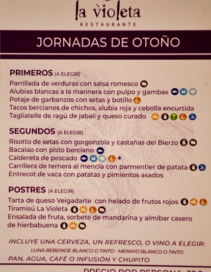 Es por ello que La Violeta da la bienvenida a su Menú de Jornadas de Otoño que estará disponible hasta Navidad. Este menú consta de 5 opciones a elegir de primeros platos, otros 5 de segundo y 3 de postre, además de agua, refresco o cerveza y vino de DO Bierzo, con un precio de 35 euros por persona. El Menú de Jornadas de Otoño se oferta de lunes a viernes en horario de cenas, los sábados en horario de comida y cena y el domingo solamente para comer, ya que el restaurante no cuenta con servicios de cenas este día. Al margen de este menú, La Violeta tiene disponible su carta para todos los servicios y el Menú Ejecutivo que se encuentra disponible durante todo el año de lunes a viernes en horario de comidas por 19,80 euros.