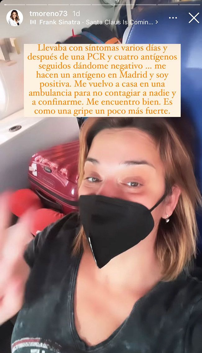 La presentadora Toñi Moreno ha confirmado desde una ambulancia su positivo en COVID-19. "Llevaba con síntomas varios días y, después de una PCR y cuatro antígenos seguidos dándome negativo, me hacen un antígeno en Madrid y soy positiva", explica, añadiendo que "me vuelvo a casa en una ambulancia para no contagiar a nadie y a confinarme. Me encuentro bien. Es como una gripe un poco más fuerte", afirma.