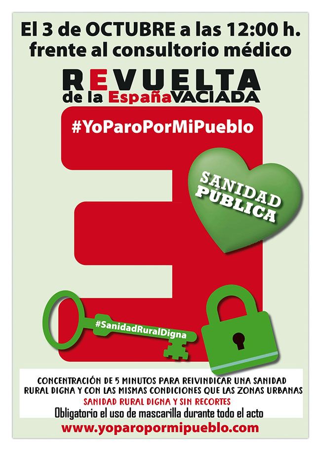 Esta iniciativa pretende que todos los pueblos de España se sumen al parón de cinco minutos en favor de la sanidad rural. “No se puede permitir que la pandemia del coronavirus sea una excusa encubierta para recortar servicios sanitarios en las zonas rurales e implementar un modelo desde las administraciones públicas que siga recortando derechos”, aseguraron los organizadores.
