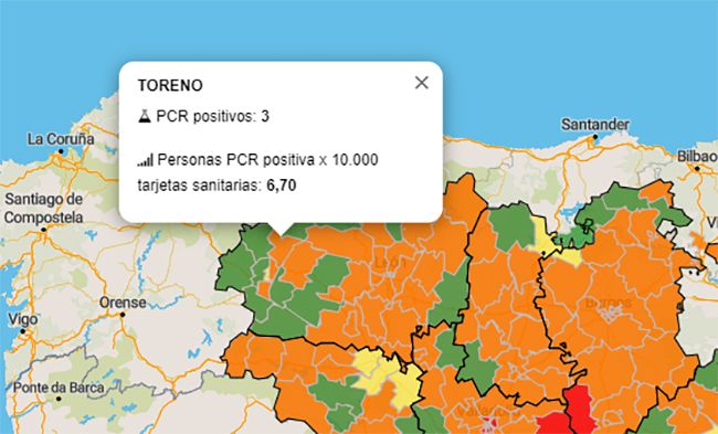 Mapa de PCR positivos contabilizadas en los últimos 7 días / Junta CyLEl área sanitaria de Toreno ha ascendido a 'alerta naranja' este jueves, con 3 nuevos casos de coronavirus confirmados a través de prueba PCR en la última jornada, según el informe diario de la Junta. Esta zona se ha mantenido desde el inicio de la pandemia con registros muy bajos de coronavirus, llegando a estar durante varias semanas incluso con cero casos, una situación que ha dado un giro completo al ascender en nivel de alerta.
