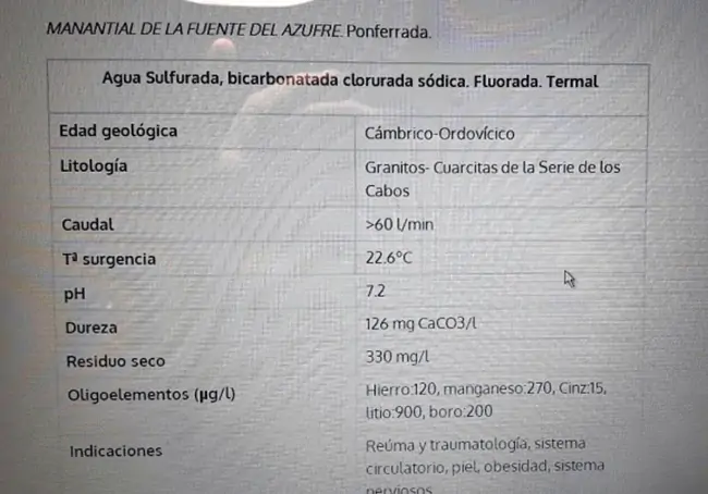 Posteriormente y mucho después del cierre del balneario, el Ayuntamiento ha realizado varios análisis químicos en distintas épocas. En uno de ellos define este agua como “sulfurada, bicarbonatada clorurada sódica, fluorada y termal”, con un caudal estimado de más de 60 l/min., una temperatura de surgencia de 22,6ºC y pH ligeramente ácido de 7,2 entre otros parámetros.
