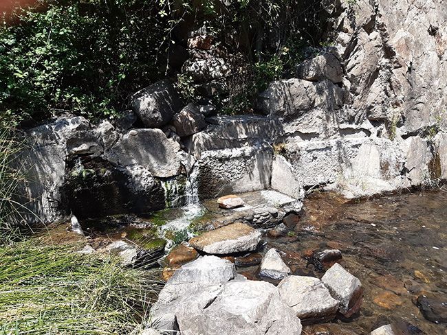 El origen de las aguas mineromedicinales suele tener relación con el trayecto de las aguas subterráneas que manan en puntos llamados ‘surgencias’. Tanto las aguas de lluvia como las de origen hidrotermal se van filtrando por los estratos de cuarcita y por las fracturas naturales del granito (diaclasas) y alcanzan las zonas de metamorfismo de contacto con las cuarcitas. A lo largo de su recorrido van recogiendo las emanaciones de gas sulfhídrico procedente de las emisiones magmáticas, dando lugar a ácido sulfhídrico y a sulfatos. Ello provoca los vapores gaseosos con olor típico a huevos podridos, detectable en las proximidades de las ‘surgencias’. Es el origen magmático el que hace que la temperatura del manantial se mantenga constante a lo largo de todo el año en torno a los 20ºC y sea por tanto apta para el termalismo. Pero, ¿cuál es su composición química? ¿es realmente un agua mineromedicinal? Los primeros análisis químicos tuvieron lugar a finales del siglo XIX y principios del siglo XX y en ellos se puso de manifiesto su riqueza en azufre, que emana como ácido sulfhídrico pero que rápidamente interacciona con los elementos de la zona formando sulfatos. Las primeras citas sobre la existencia de esta fuente se recogen en el “Diccionario geográfico-estadístico-histórico de España y sus posesiones de ultramar” de Pascual Madoz en 1850. Así, en los letreros iniciales del balneario las aguas se calificaron como “sulfuroso-sódicas sulfhídricas”. Ya en estos primeros análisis destacaba el contenido en gases.