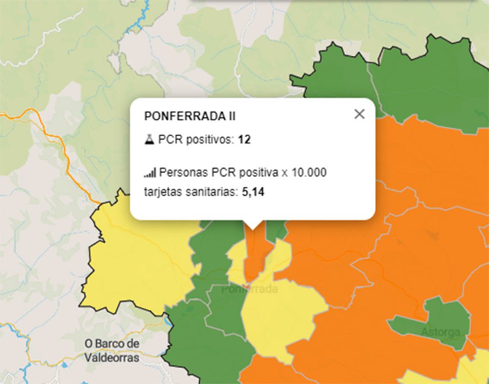 Según los datos publicados este lunes por la Consejería de Sanidad de la Junta de Castilla y León, la zona básica de salud de Bembibre permanece en 'alerta naranja' y el área de salud de Ponferrada II se ha teñido también con esta alerta. Ponferrada I, IV y Villafranca del Bierzo han activado la alerta amarilla.