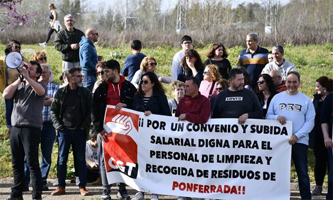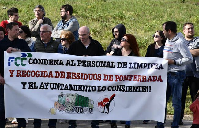 Así, la huelga de basura y varios de sus trabajadores se han personado también en las inmediaciones de la Térmica Cultural, acompañados por varias pancartas. En la primera de ellas se denuncia que "FCC condena al personal de limpieza y recogida de residuos de Ponferrada, y el Ayuntamiento lo consiente!", mientras que en la otra bajo la firma de CGT se alza la voz "¡Por un convenio y subida salarial digna para el personal de limpieza y recogida de residuos de Ponferrada!".
