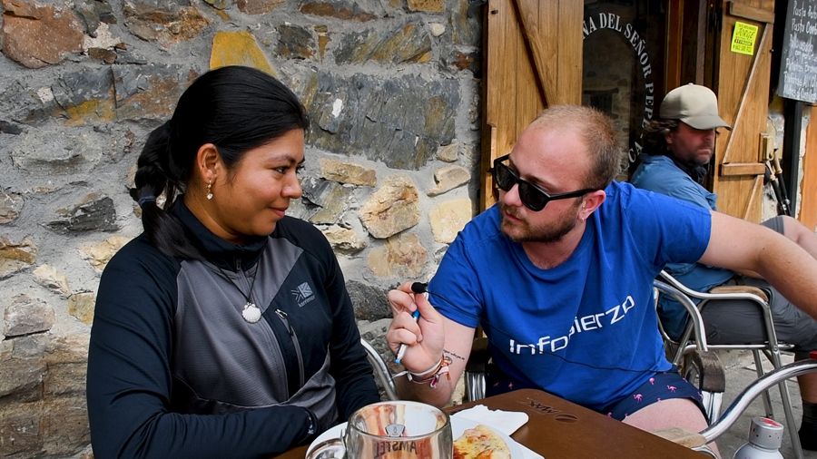 Entre las principales calles de Molina se avistan mochilas, bastones, botas, gorros y cremas solares en pieles quemadas por el incesante Sol que también está siendo uno de los protagonistas del verano en El Bierzo. Como por ejemplo Elenia, una peregrina con origen El Salvador (América Central), que decide caminar hacia Compostela como si de un "retiro espiritual" se tratara. Una controladora aérea que tiene pensando cerrar el Camino con la llegada al Obradoiro, pero no descarta volver a empezarlo "en otra ocasión" para acabarlo con la quema de botas peregrinas en Finisterre. Mientras tanto, esta salvadoreña disfruta de su almuerzo en La Tienda del Señor Pepe, un espacio cercano al río Meruelo.