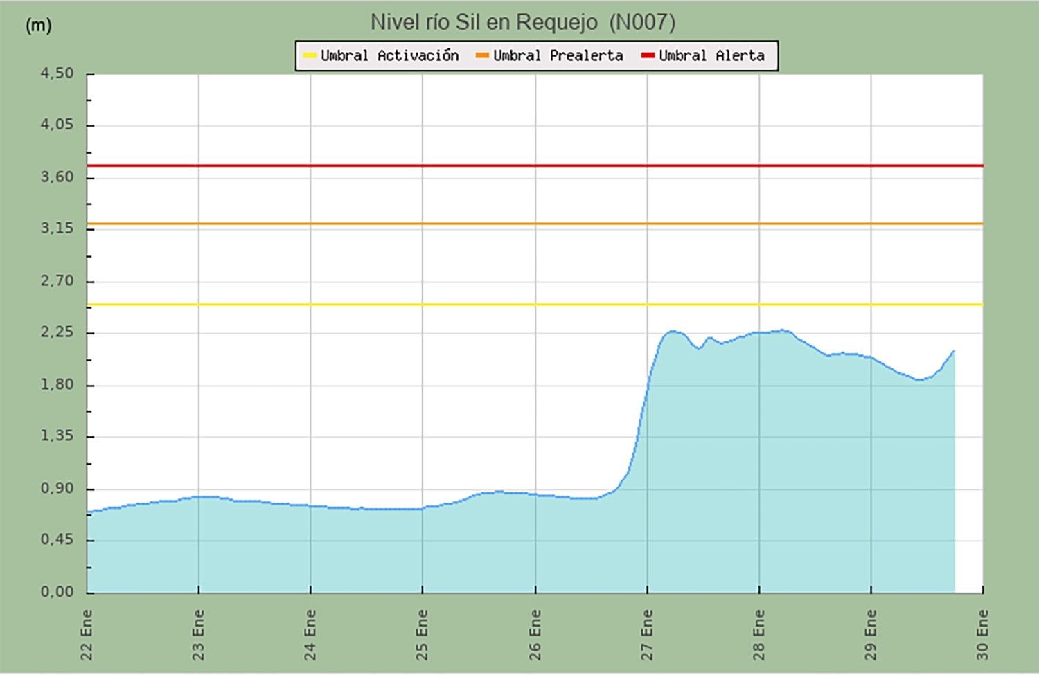 La lluvia continúa siendo la protagonista de los días en El Bierzo, con intensas precipitaciones o incluso nevadas en zonas altas a lo largo de las jornadas. Tanto es así, que los ríos comienzan a mostrar los primeros de aumento en sus caudales y niveles. En el caso del río Sil a su paso por la localidad de Requejo se acerca al umbral de activación con 156,39 metros cúbicos por segundo. Por otro lado, el nivel del Sil a su paso por Ponferrada se mantiene, por el momento, constante con 3,34 metros cúbicos por segundo.